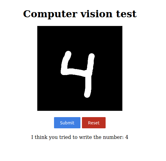 We have created a model that is able to predict digits and we've also tried to use our saved model and test it on some images we created in GIMP. We can also use this model on a web application so that we can let users draw digits and do predictions on the drawings. I'm not going to go into detail of that process now (I'll maybe save it for later), but you can test it here.